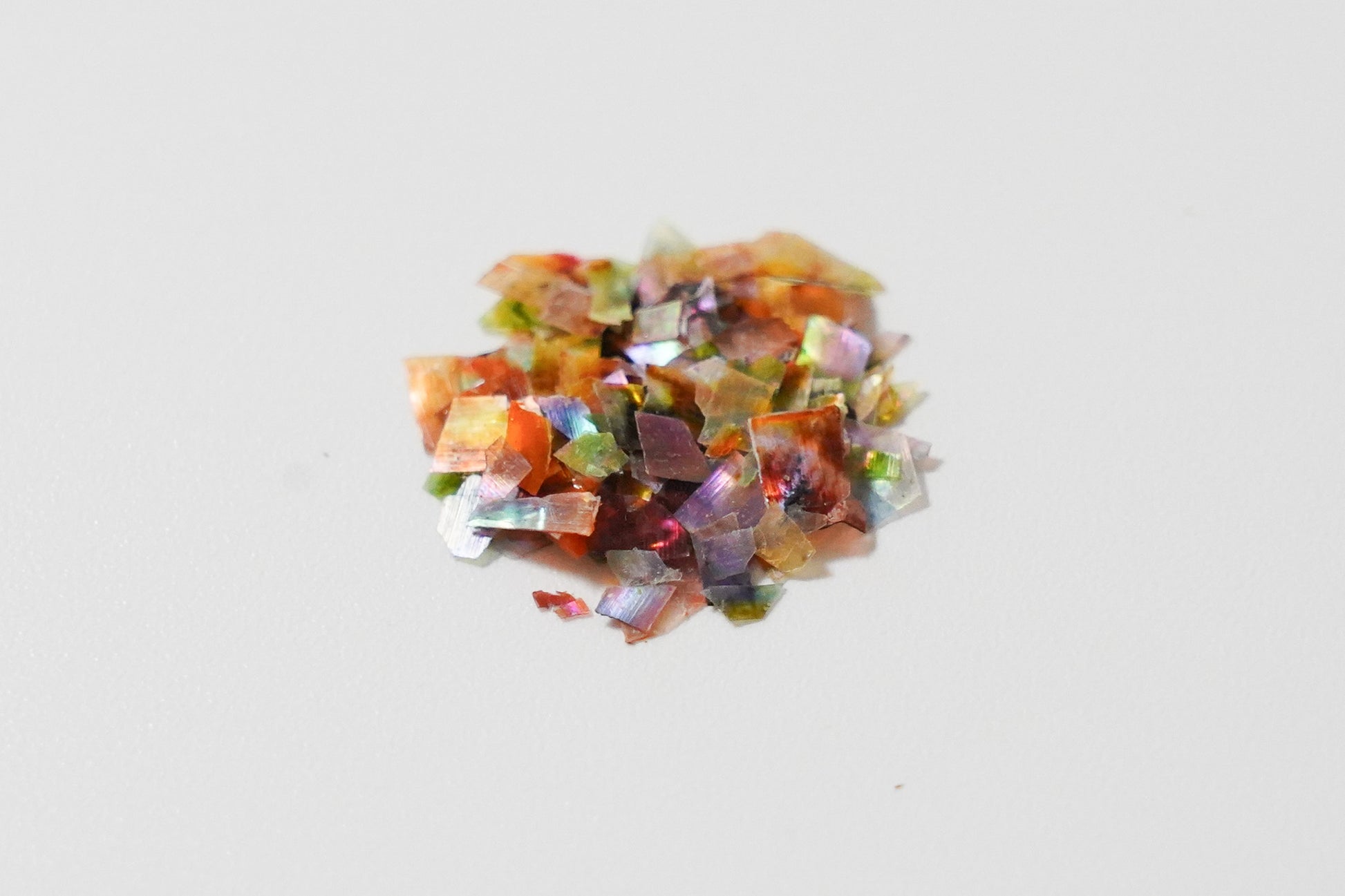 従来のネイル素材のシェルフレークと比べ、とても薄く操作性が優れており、透け感の美しいフレーク素材です。