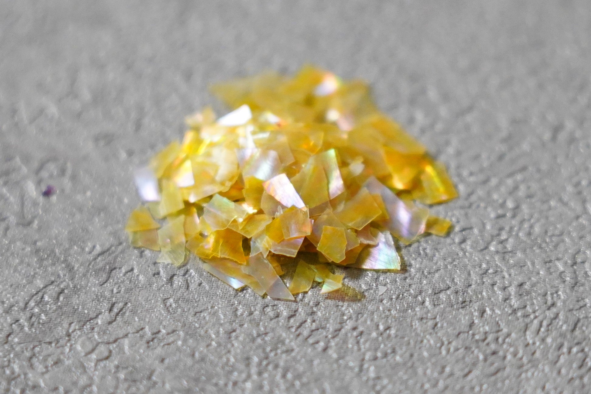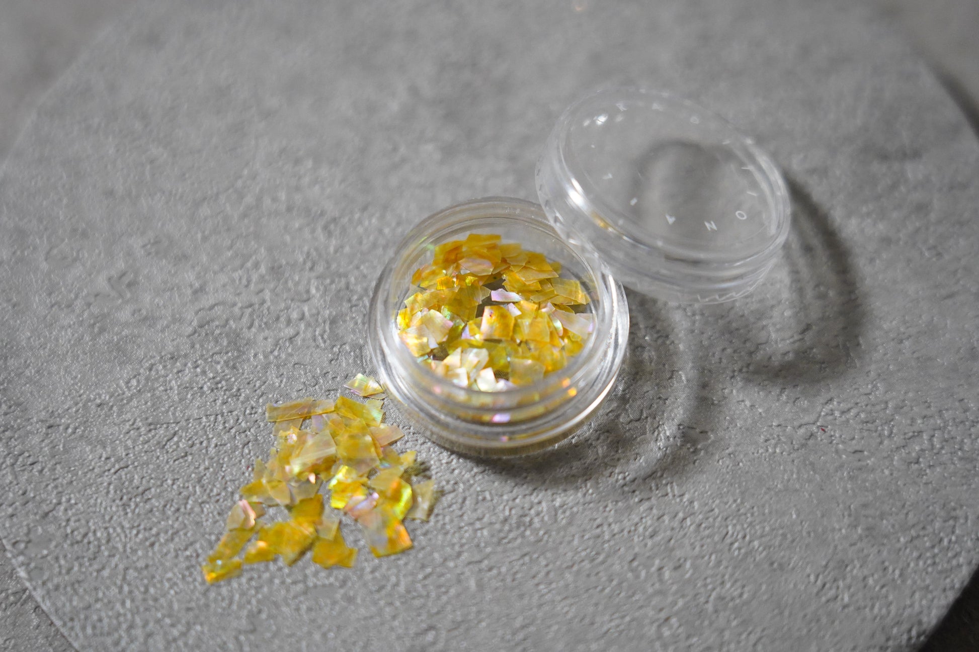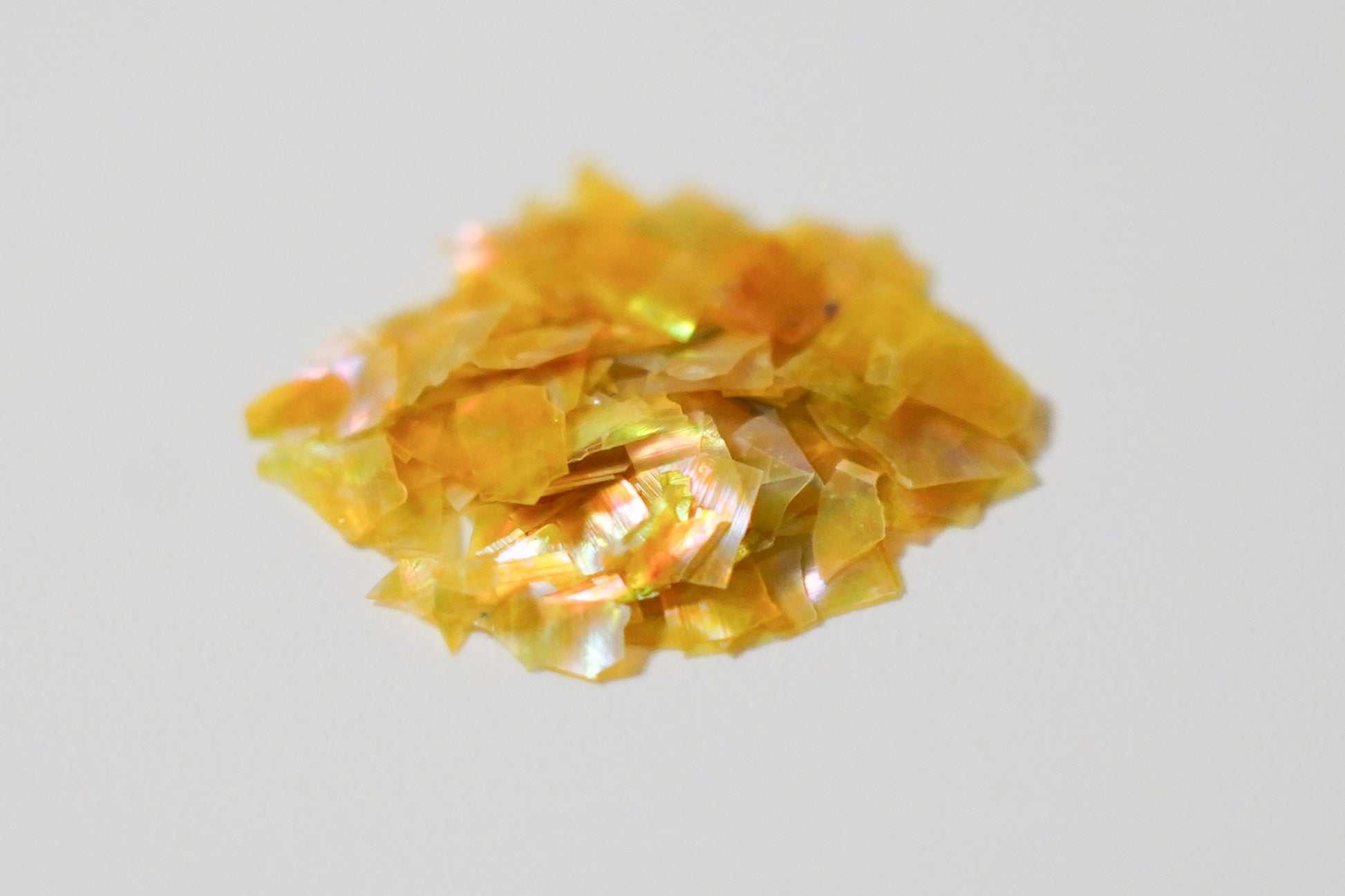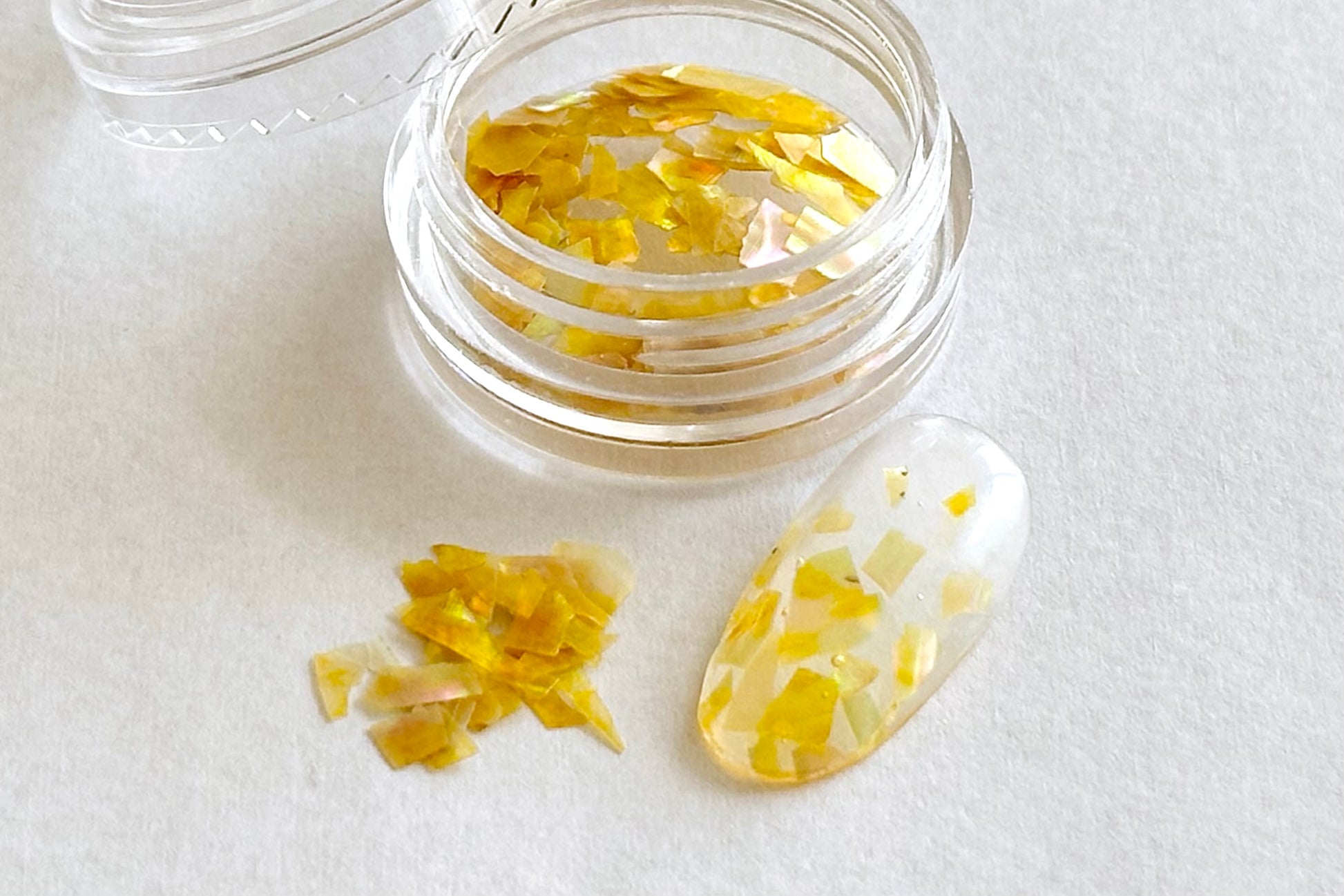 従来のネイル素材のシェルフレークと比べ、とても薄く操作性が優れており、透け感の美しいフレーク素材です。