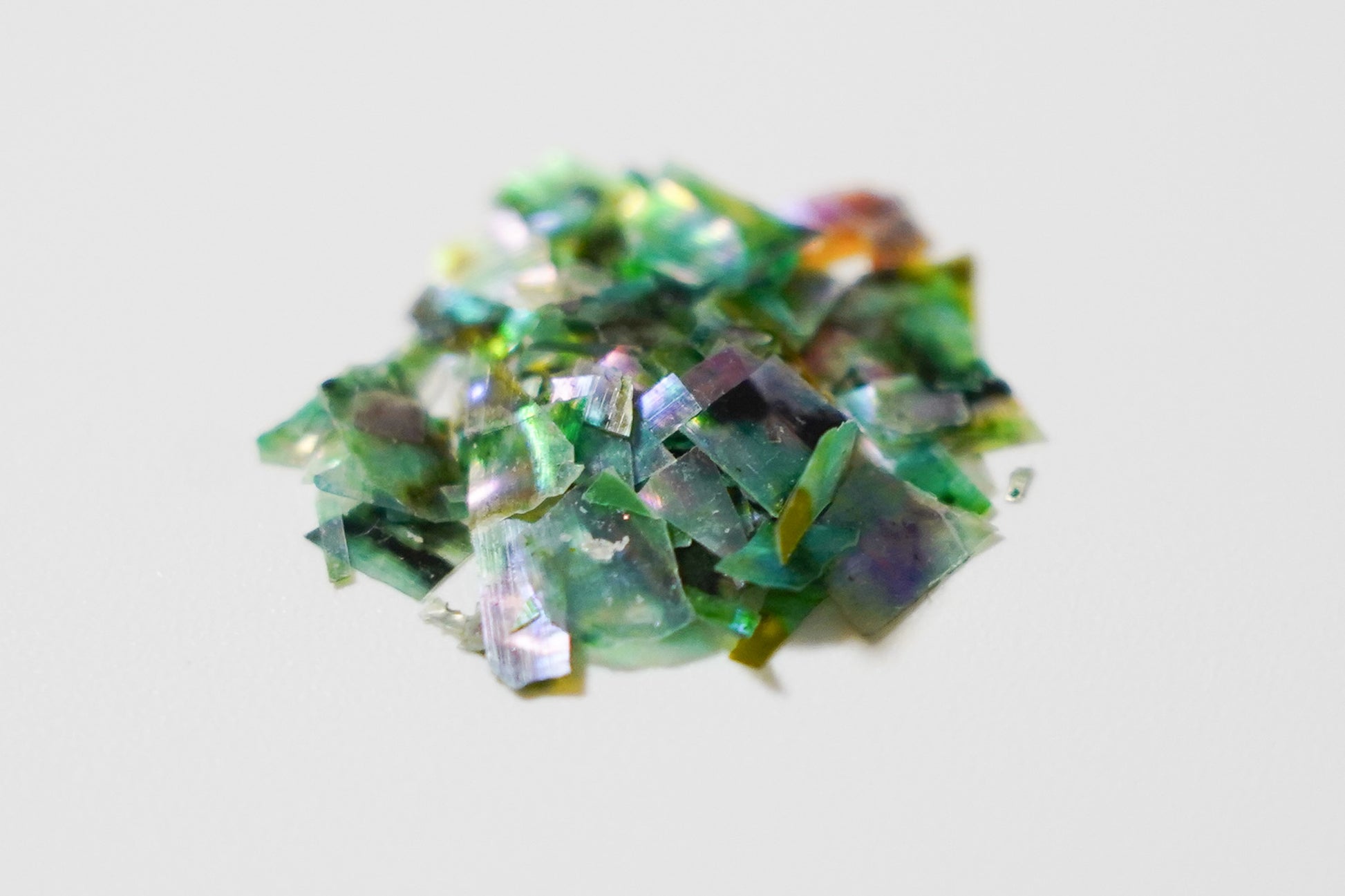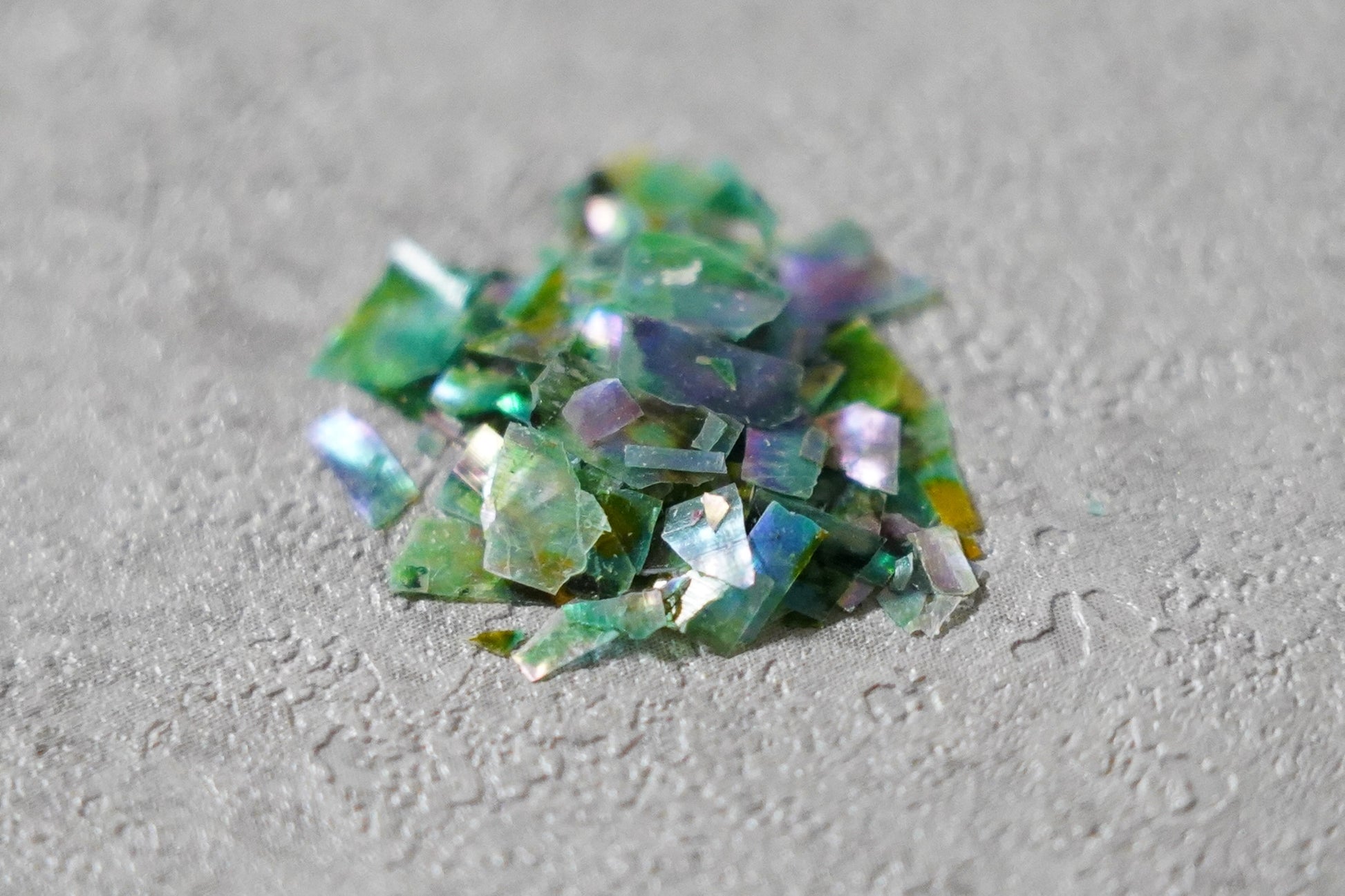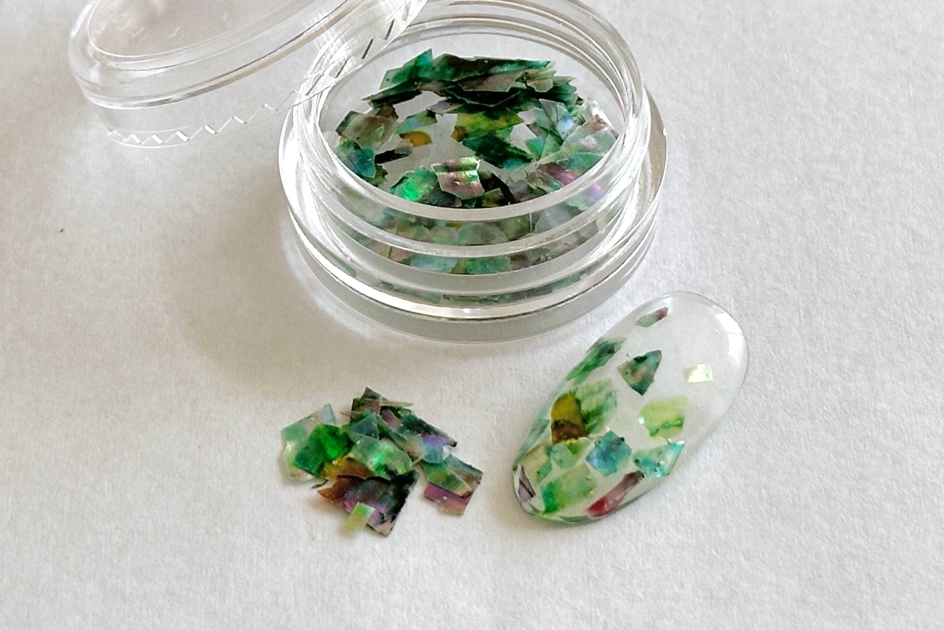従来のネイル素材のシェルフレークと比べ、とても薄く操作性が優れており、透け感の美しいフレーク素材です。