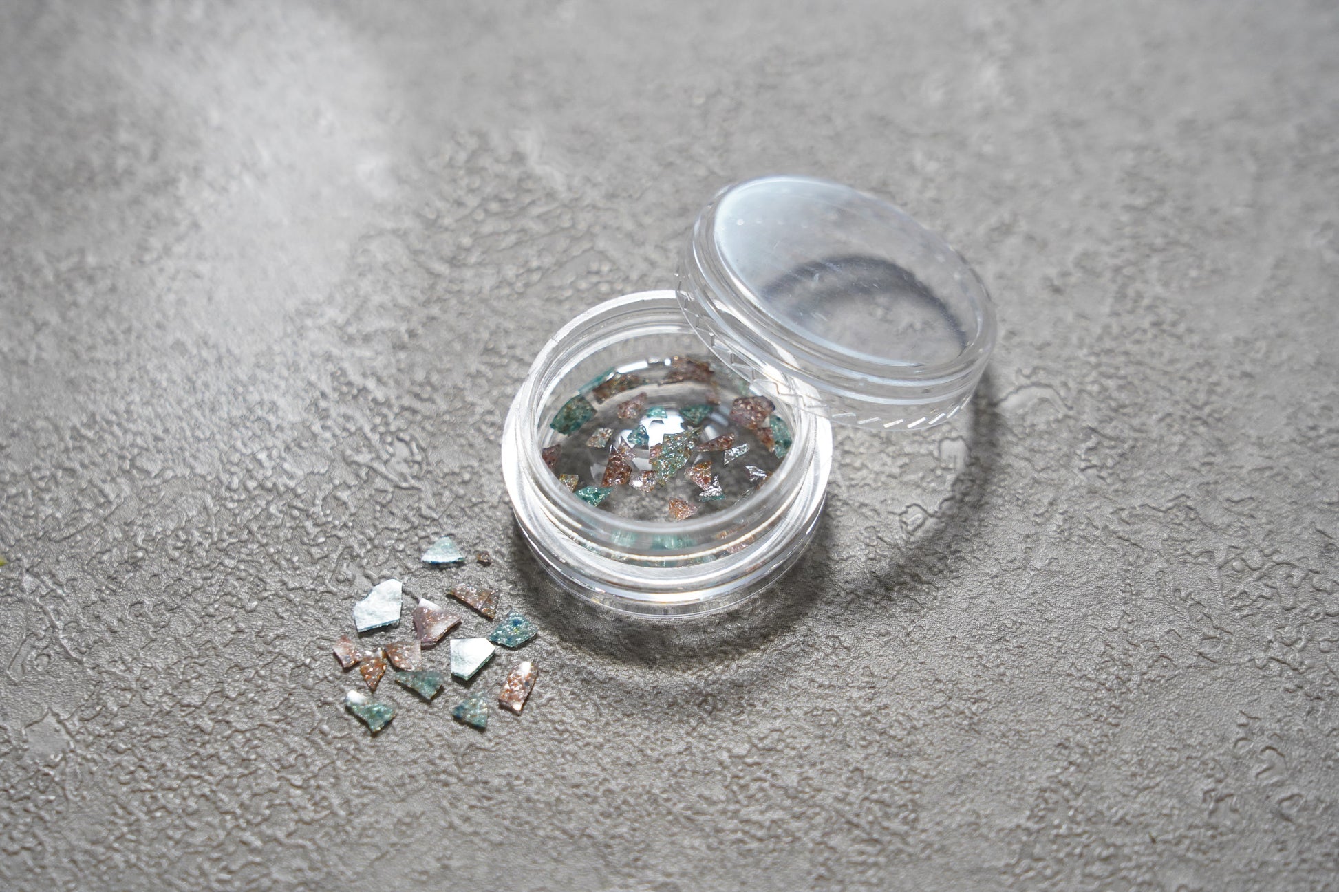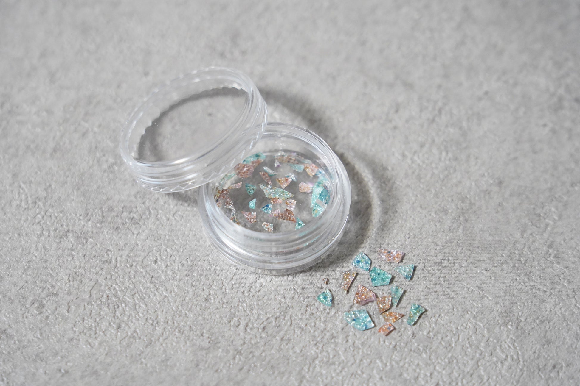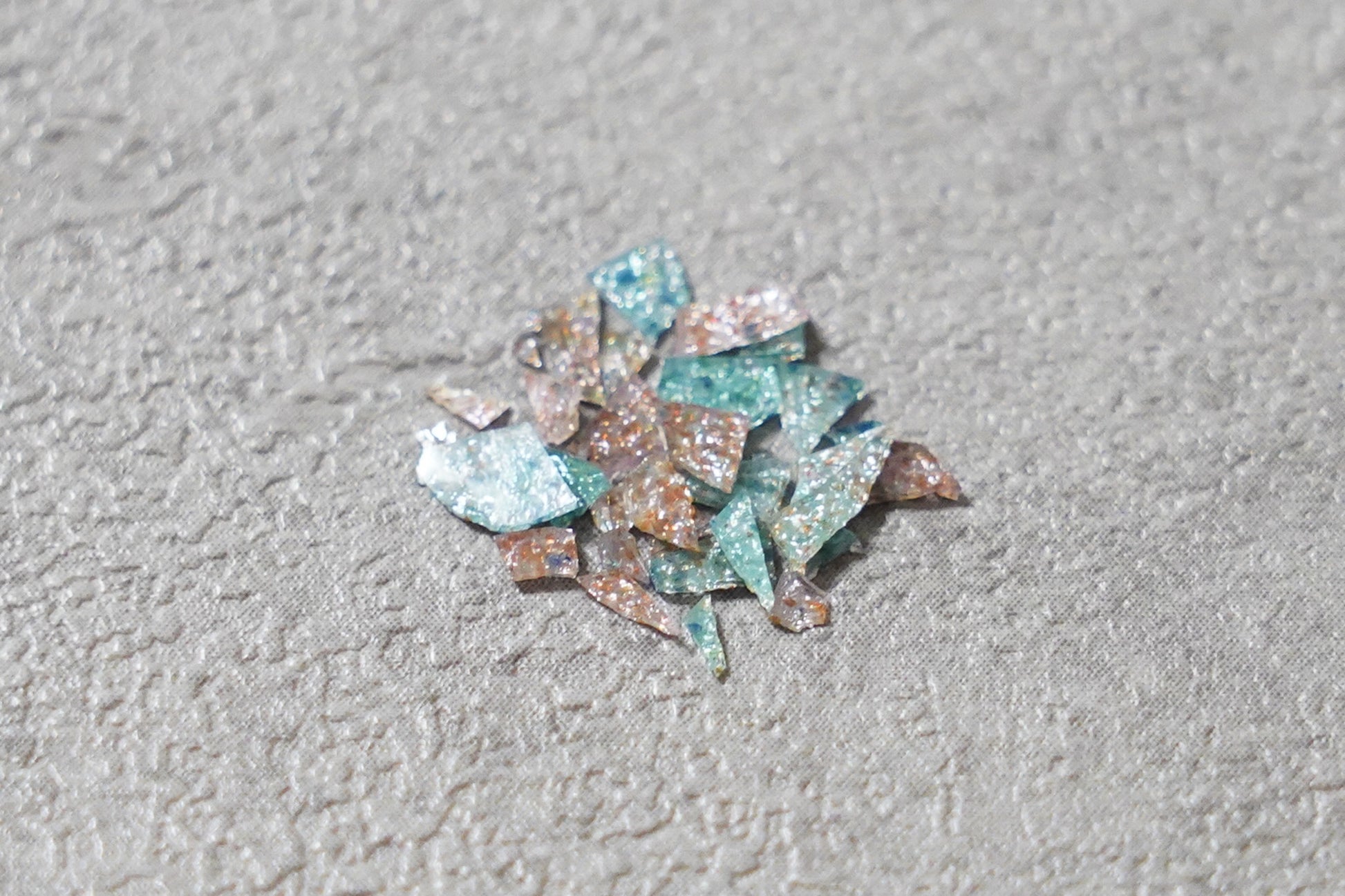※ガラス釉薬で作られておりますので、キッチンペーパーなどに七宝フレークを挟み、上からピンセットの柄の部分などの硬い物で圧を加えると簡単に割ることができます。お好みのサイズに調整してご使用ください。(割ったときに素材が飛び散らないよう、必ずキッチンペーパーなどで押さえた状態で割ってください)
