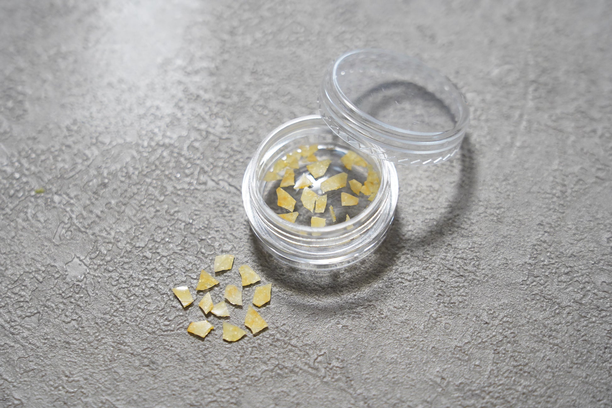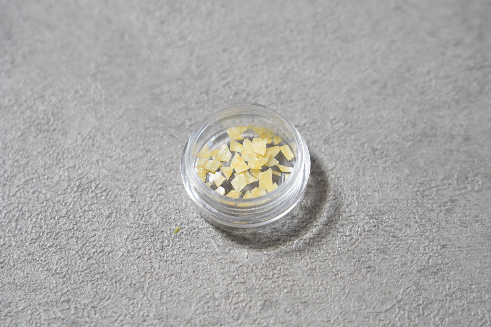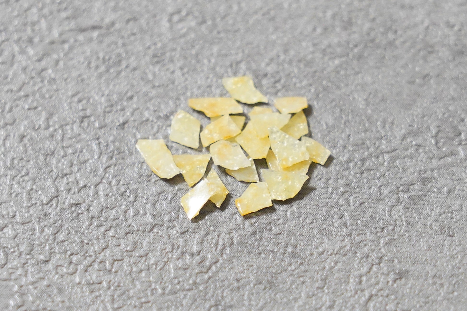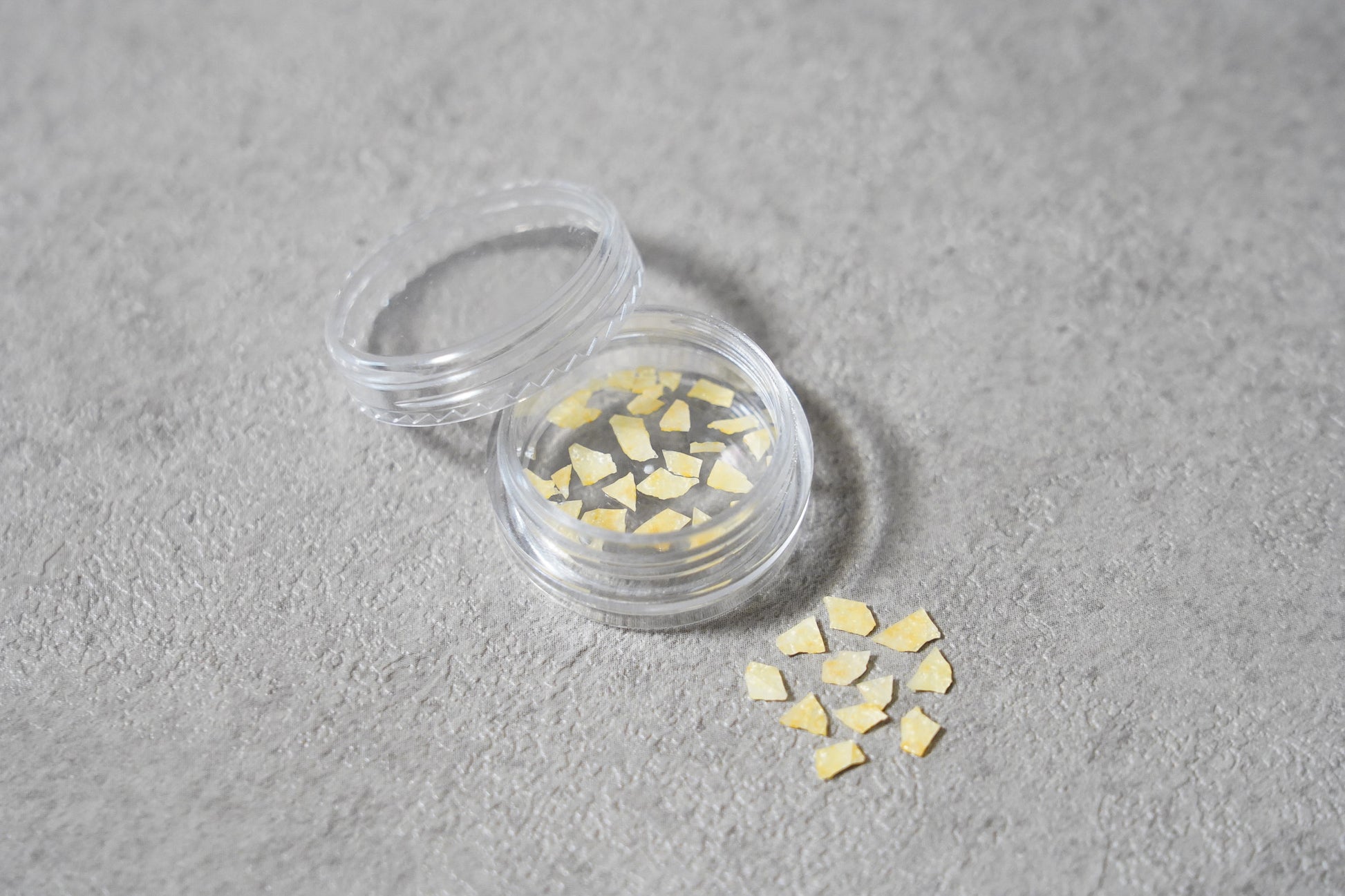 ※ガラス釉薬で作られておりますので、キッチンペーパーなどに七宝フレークを挟み、上からピンセットの柄の部分などの硬い物で圧を加えると簡単に割ることができます。お好みのサイズに調整してご使用ください。(割ったときに素材が飛び散らないよう、必ずキッチンペーパーなどで押さえた状態で割ってください)
