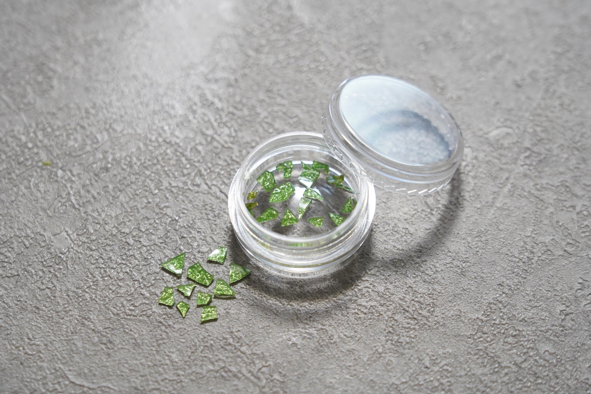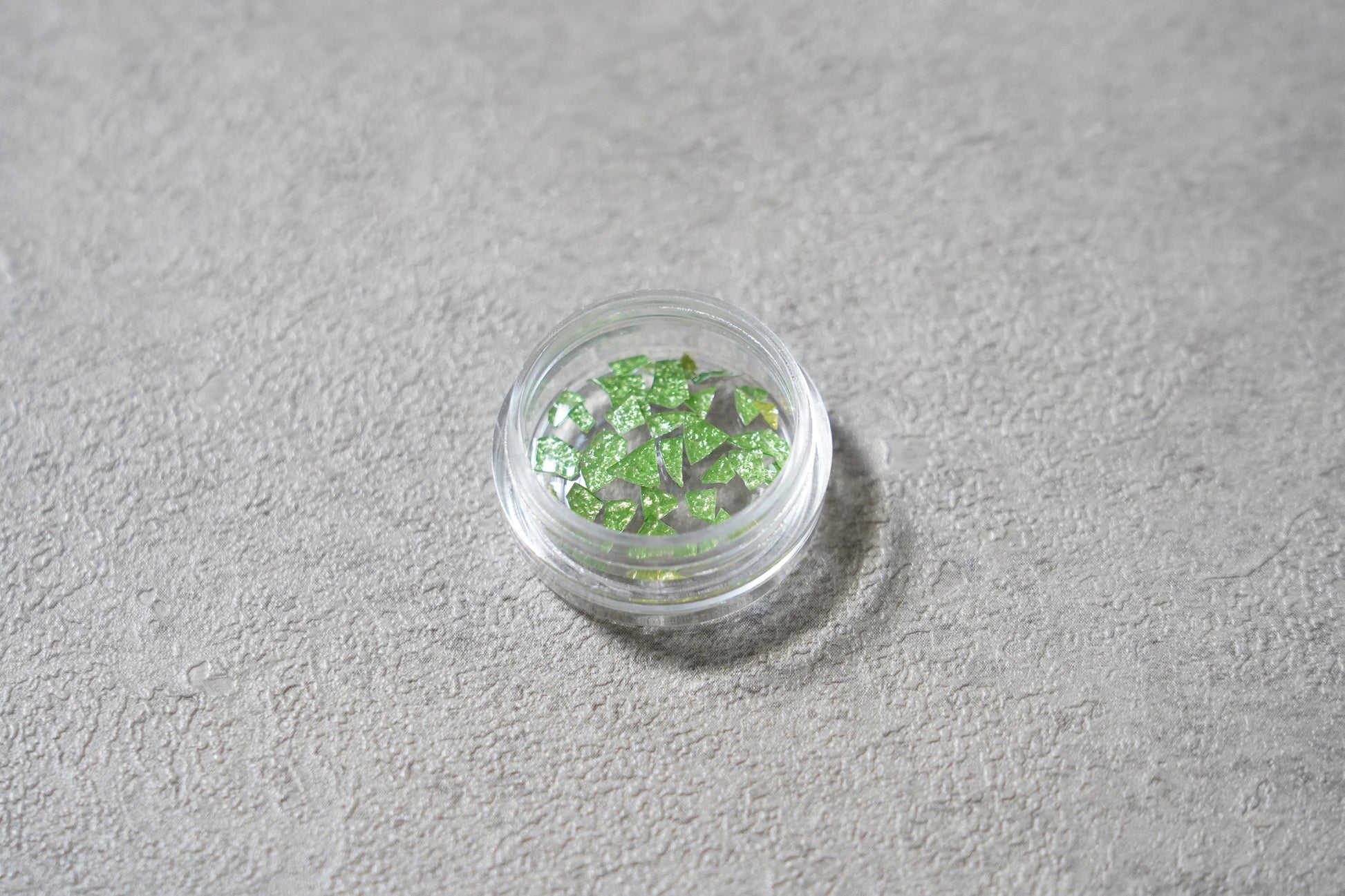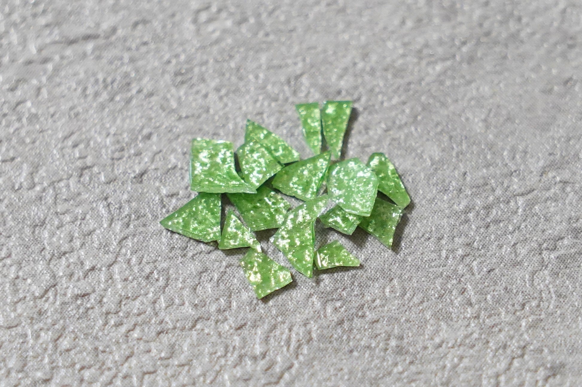 ※ガラス釉薬で作られておりますので、キッチンペーパーなどに七宝フレークを挟み、上からピンセットの柄の部分などの硬い物で圧を加えると簡単に割ることができます。お好みのサイズに調整してご使用ください。(割ったときに素材が飛び散らないよう、必ずキッチンペーパーなどで押さえた状態で割ってください)