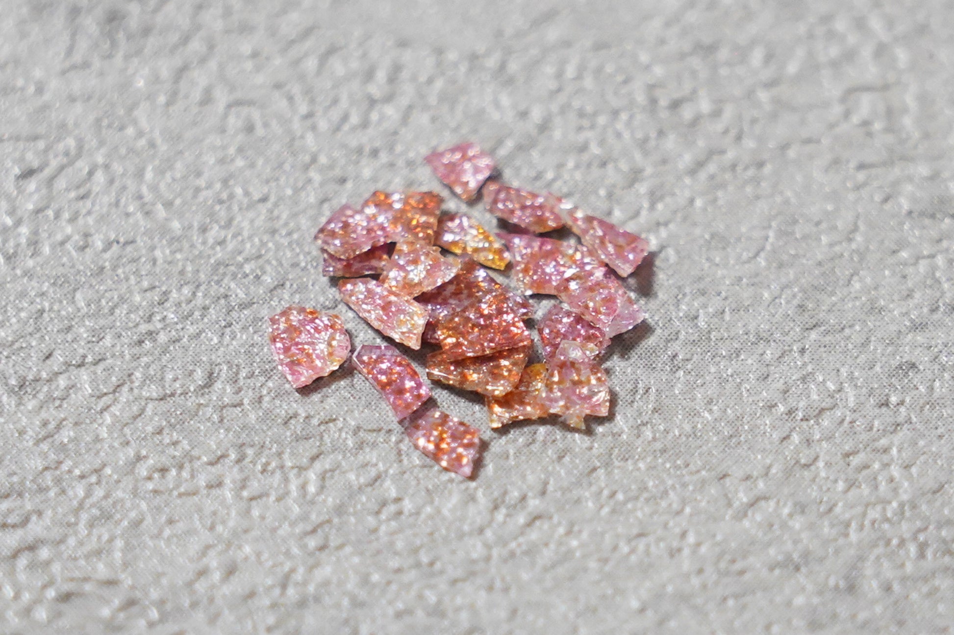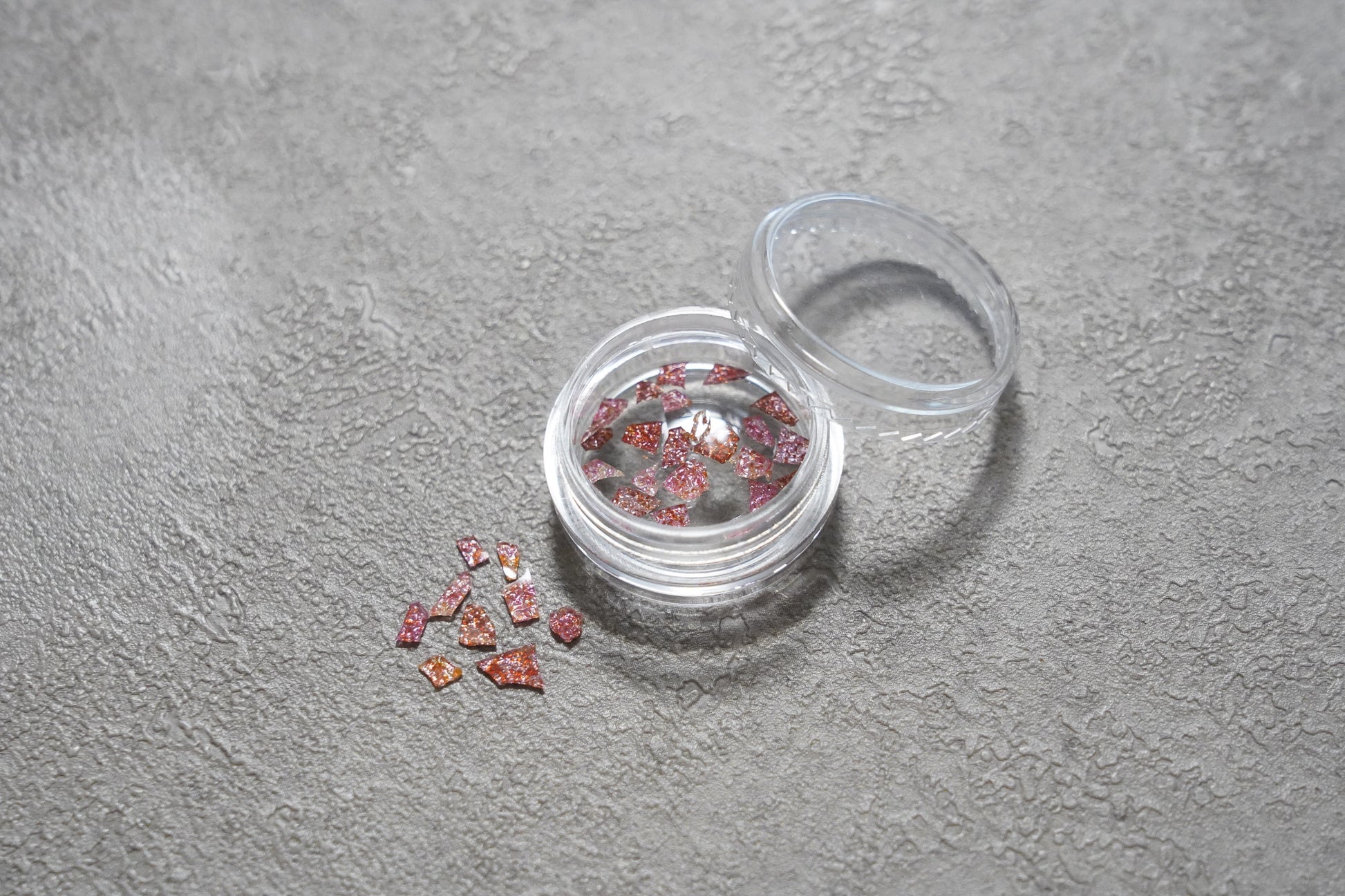 ※ガラス釉薬で作られておりますので、キッチンペーパーなどに七宝フレークを挟み、上からピンセットの柄の部分などの硬い物で圧を加えると簡単に割ることができます。お好みのサイズに調整してご使用ください。(割ったときに素材が飛び散らないよう、必ずキッチンペーパーなどで押さえた状態で割ってください)